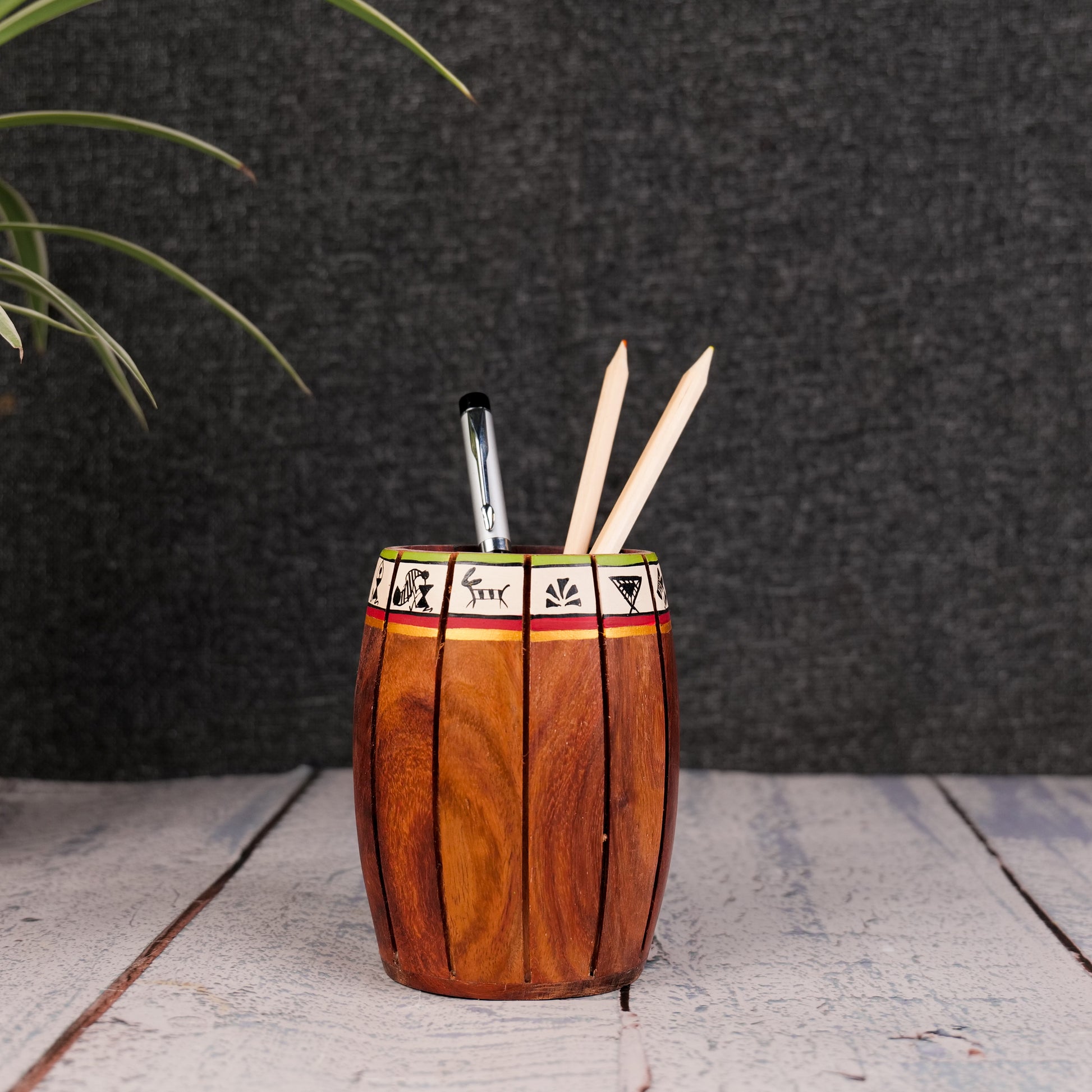 'Warli Barrel' Wooden Cutlery Cum Stationary Holder