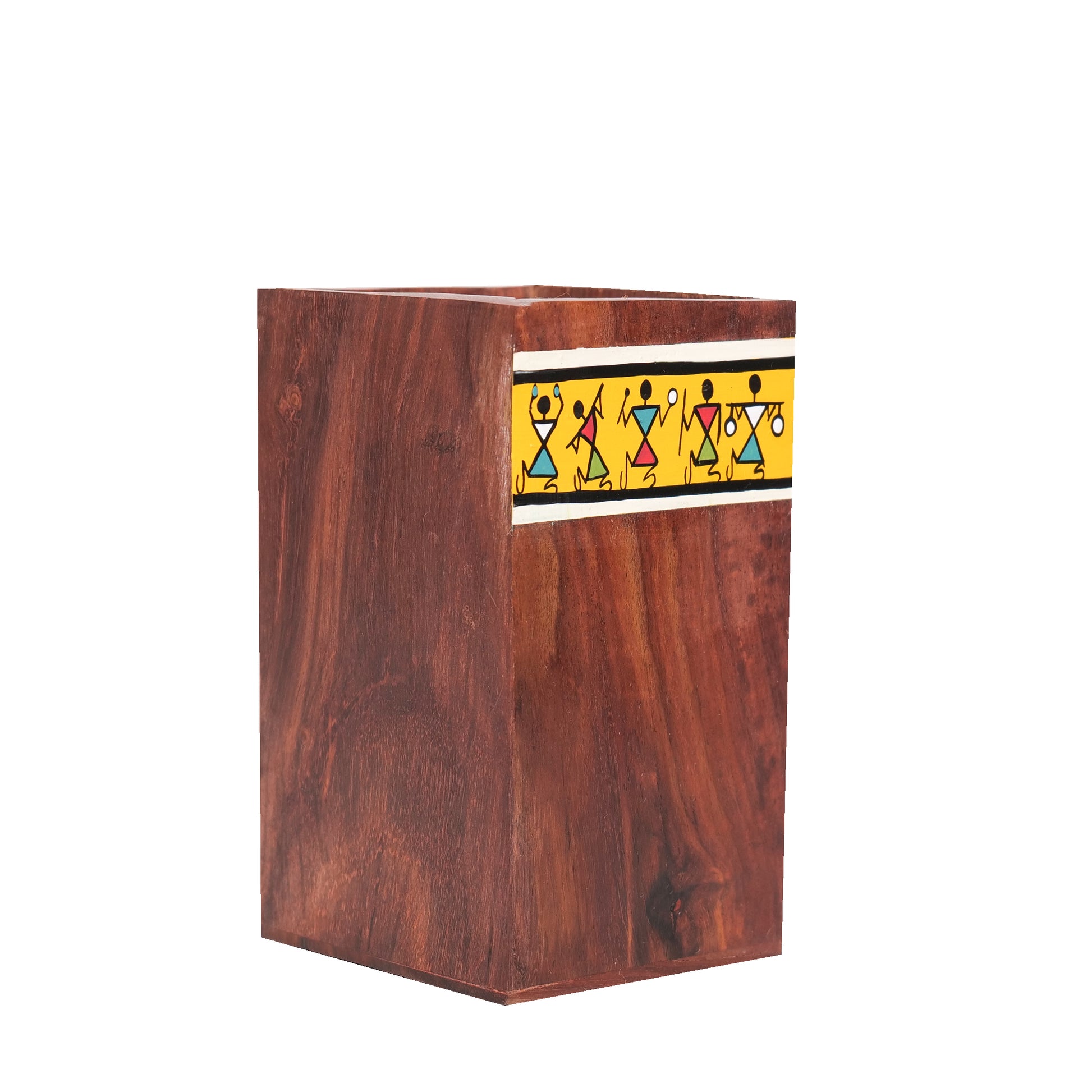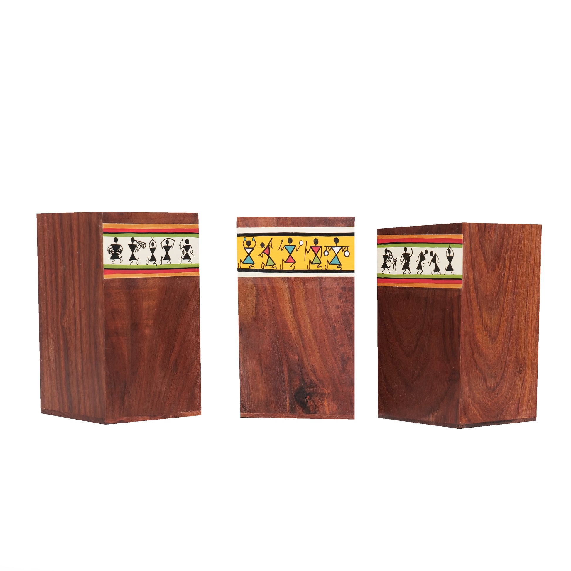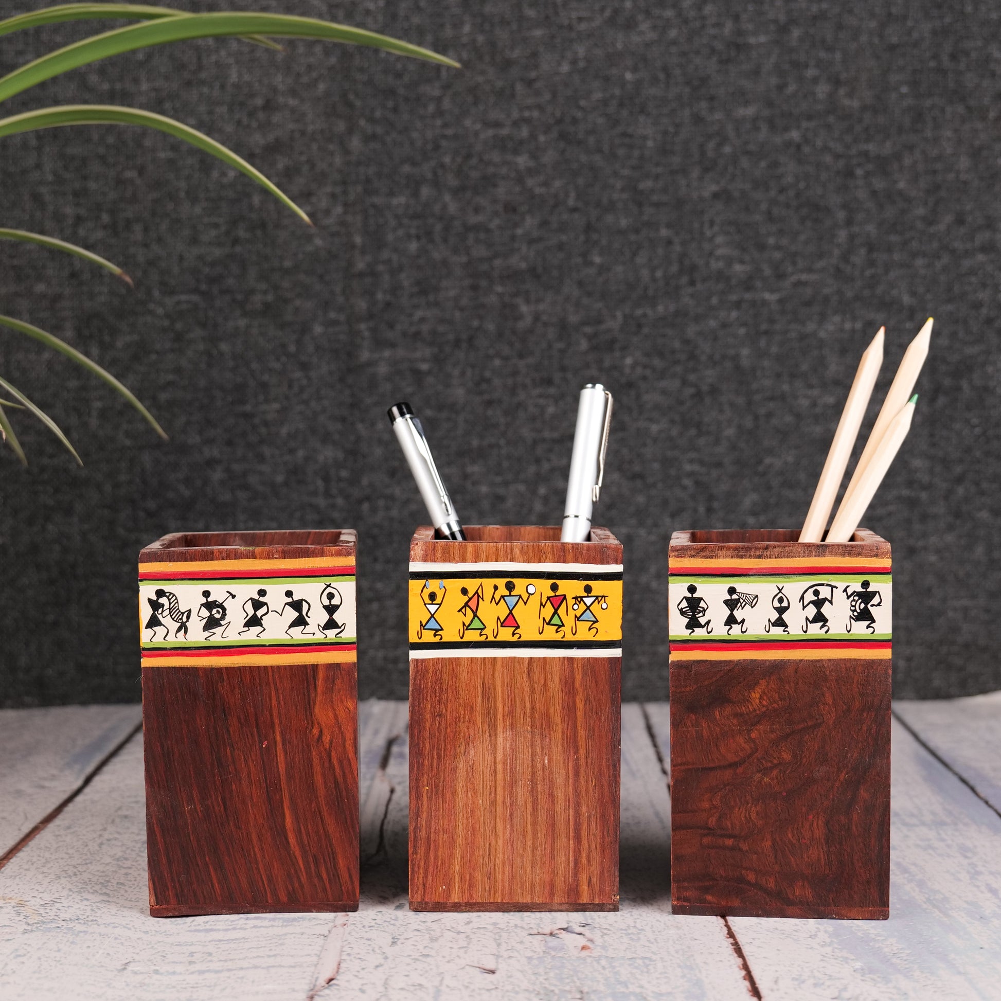 Transform your dining table into a harmonious blend of functionality and artistry with our wooden cutlery holder cum pen stand set. Embrace the convenience of organized essentials while enjoying the beauty of handcrafted warli art. Crafted from high-quality sheesham wood, these holders boast premium craftsmanship, offering durability and a natural elegance that enhances the overall aesthetic of kitchen or work area. Whether you're a student, professional, or someone who appreciates a well-organized space with an artistic touch, this set is tailored to meet your needs.